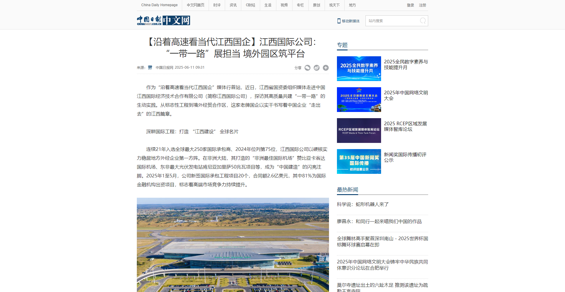 近日,由江西省国资委主办的“沿着高速看当代江西国企”主题宣传活动正式开启,多家中央及省级媒体深入探访江西国企改革发展一线。作为此次媒体行的首站,公司深耕境外市场四十载、引领江西企业抱团出海的发展实践,成为多家媒体聚焦国资国企高质量发展的热议焦点,引起媒体高度关注与深入报道。