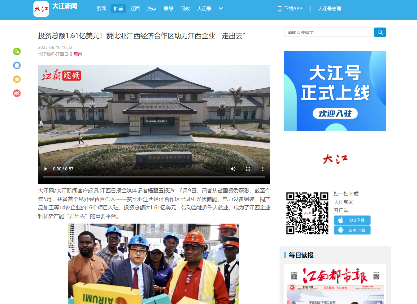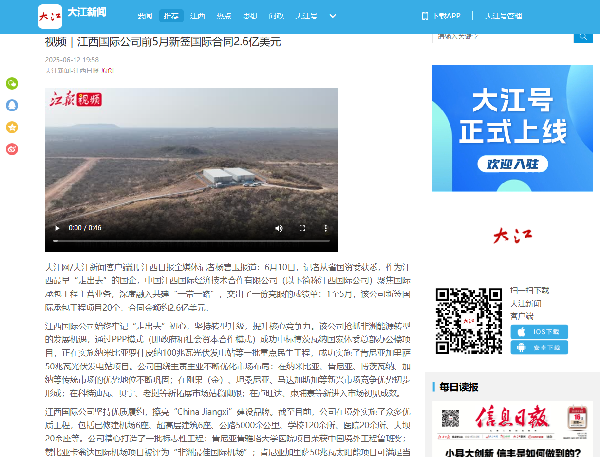 《赞比亚江西经济合作区助力江西企业“走出去”》 媒体链接: 《江西国际公司前5月新签国际合同2.6亿美元》 媒体链接: https://tt.jxnews.com.cn/news/2734901?app=jxttn&uid=2517610 《投资总额1.61亿美元!赞比亚江西经济合作区助力江西企业“走出去”》 媒体链接: https://tt.jxnews.com.cn/news/2732991?app=jxttn&uid=2517610&jxttn=