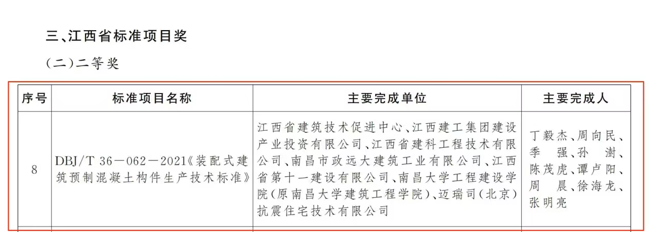 近日,公司所属江西省建科工程技术有限公司参编的《装配式建筑预制混凝土构件生产技术标准》DBJ/T36-062-2021,成功获评“2025年度江西省省长质量奖和专利奖——江西省标准项目二等奖”。 近年来,江西建科深耕行业标准编制领域,已参与多项行业及地方标准编制工作。此次获评的《技术标准》,深度融合国内外先进技术经验与本土实践,立足全省装配式建筑发展实际,紧扣预制混凝土构件生产全流程工艺特点及施工安装需求,明确了关键技术要求。该标准既强化了生产全流程技术行为规范,为企业掌握核心技术、提升产品品质与生产效率提供清晰指引,又兼顾技术人员学习应用便利性,有效破解行业技术不统一、管理不规范等难题,对提升全省装配式建筑行业生产管理规范化水平具有重要实践意义。 江西省省长质量奖和专利奖每3年评选一次,由江西省人民政府主办、省市场监管局承办,其中江西省标准项目奖是省内标准化领域最高荣誉。2025年度共评选出一等奖5项、二等奖10项、三等奖15项及个人奖10项。
